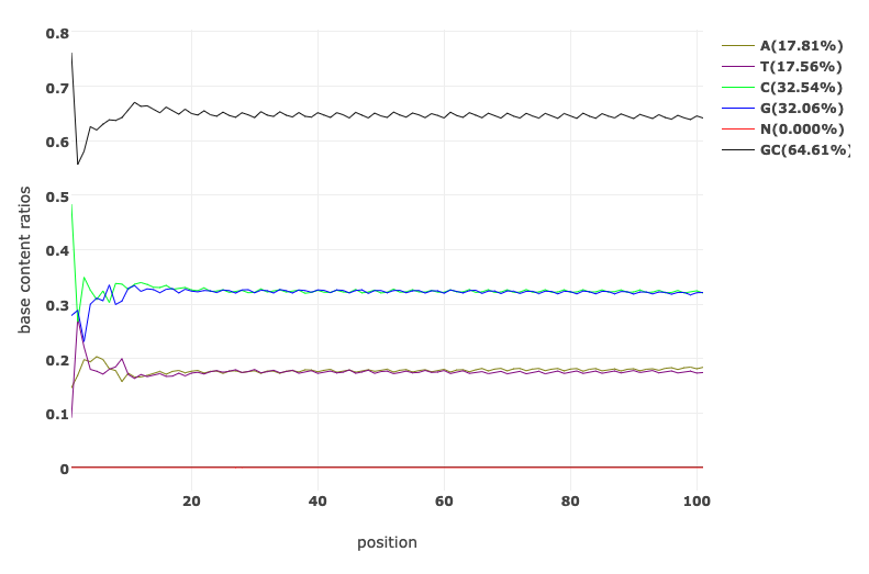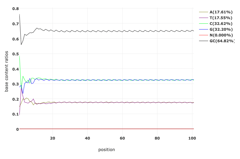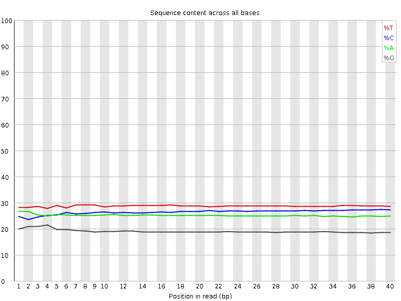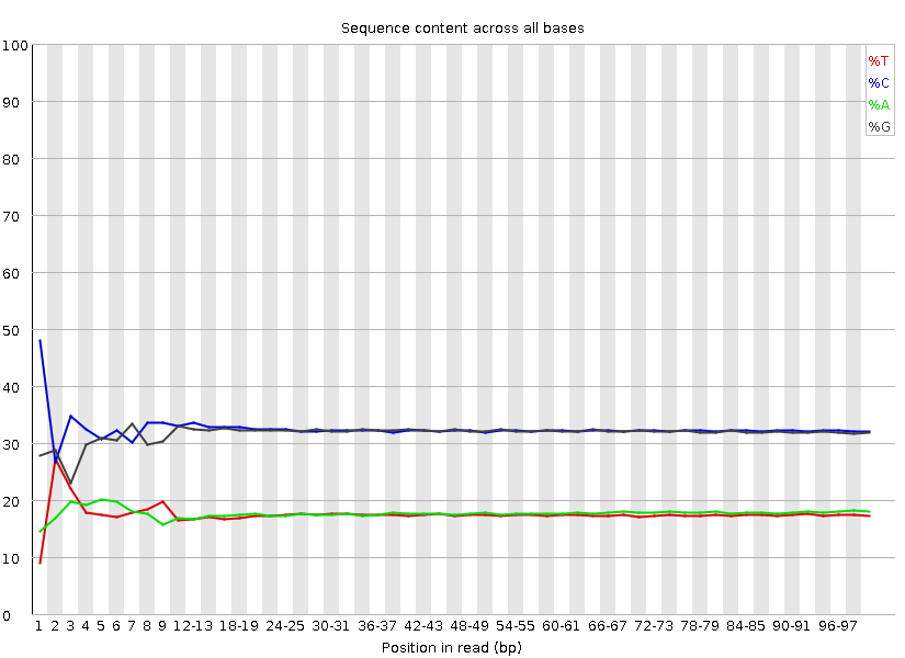 Looking at the GC content per cycle can help detect if the adapter sequence was trimmed. For a random library, it is expected to be little to no difference between the different bases of a sequence run, so the lines in this plot should be parallel with each other like in the first of the two figures below. In the second of the figures, the initial spikes are likely due to adapter sequences that have not been removed.