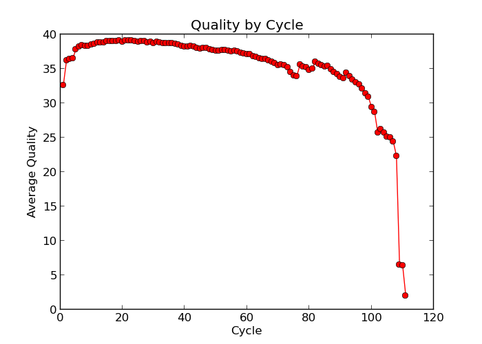 Illumina sequencing technology relies on sequencing by synthesis. One of the most common problems with this is dephasing. For each sequencing cycle, there is a possibility that the replication machinery slips and either incorporates more than one nucleotide or perhaps misses to incorporate one at all. The more cycles that are run (i.e. the longer the read length gets), the greater the accumulation of these types of errors gets. This leads to a heterogeneous population in the cluster, and a decreased signal purity, which in turn reduces the precision of the base calling. The figure below shows an example of this.