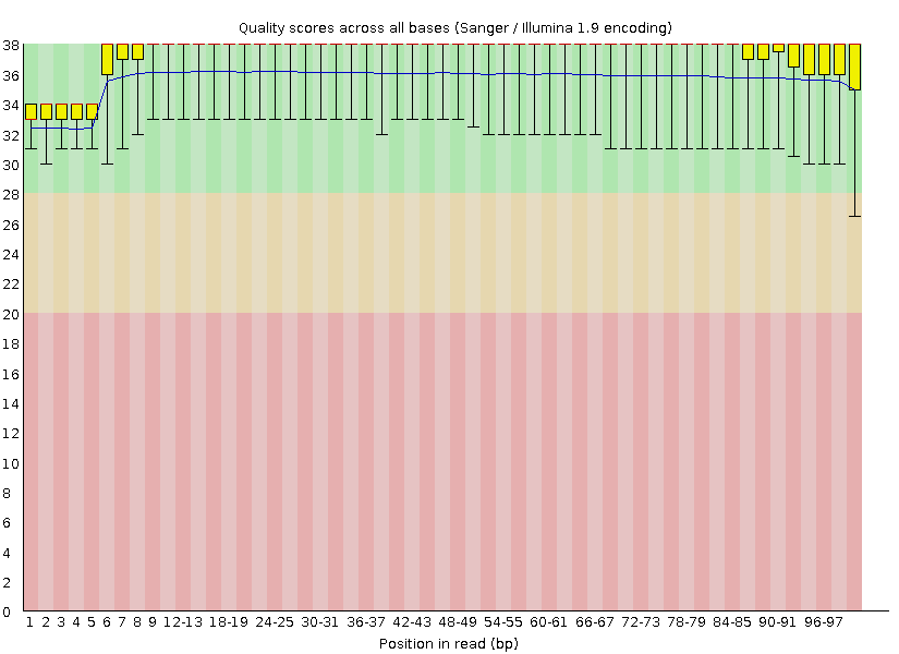 Because of dephasing, it is possible to have high-quality data at the beginning of the read but really low-quality data towards the end of the read. In those cases you can decide to trim off the low-quality reads, for example using a tool called Trimmomatic. In this workshop, we will do this using the tool fastp. In addition to trimming low quality reads, fastpwill also be used to trim off Illumina adapter/primer sequences.