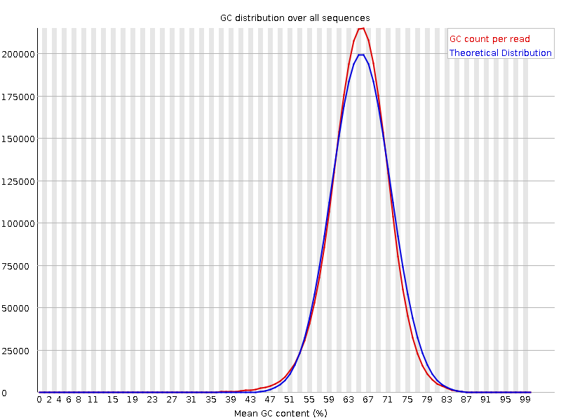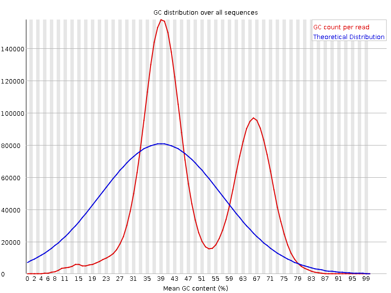 It is a good idea to compare the GC content of the reads against the expected distribution in a reference sequence. The GC content varies between species, so a shift in GC content like the one seen below (right image) could be an indication of sample contamination. In the left image below, we can see that the GC content of the sample is about the same as for the theoretical reference, at ~65%. However, in the right figure, the GC content of the sample shows two distribution, one is closer to 40% and the other closer to 65%, indicating that there is an issue with this sample — a possible missed sample. Note that, suspecting contamination is perfectly fine for the species we are dealing with (MTBC). For other bacteria where there may be possibility of gene transfer, one can imagine that, such a situation may be from inheriting some plasmids that have a totally different GC content to the bacteria chromosome (This is arguable though).