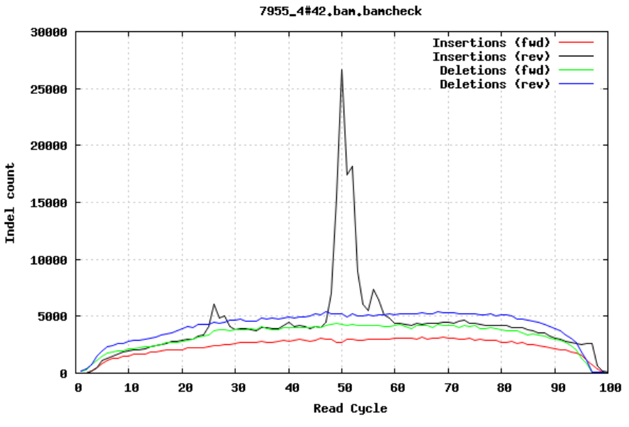 Sometimes, air bubbles occur in the flow cell, which can manifest as false indels. The spike in the second image provides an example of how this can look.