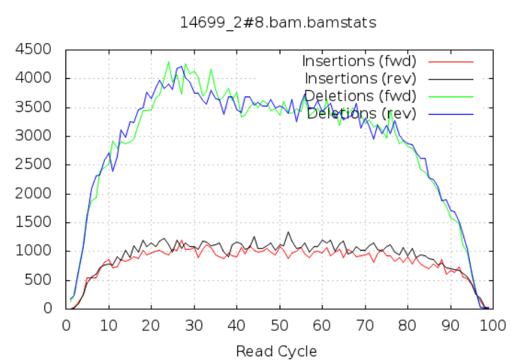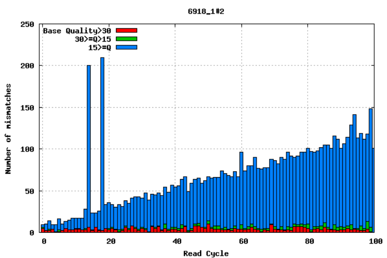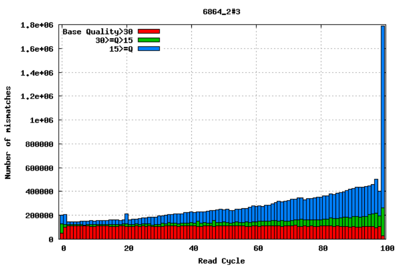 Aligning reads to a high-quality reference genome can provide insight to the quality of a sequencing run by showing you the mismatches to the reference sequence. This can help you detect cycle-specific errors. Mismatches can occur due to two main causes, sequencing errors and differences between your sample and the reference genome, which is important to bear in mind when interpreting mismatch graphs. The figures below show an example of a good run (top) and a bad one (bottom). In the first figure, the distribution of the number of mismatches is even between the cycles, which is what we would expect from a good run. However, in the second figure, two cycles stand out with a lot of mismatches compared to the other cycles.