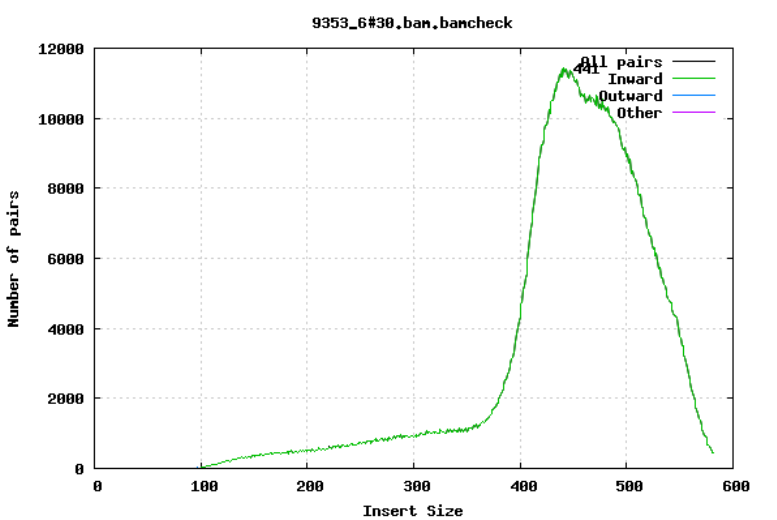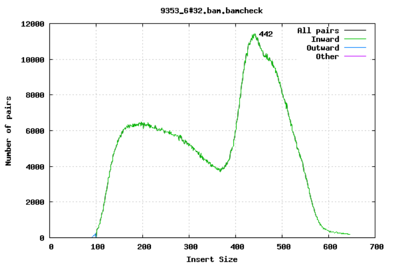 For paired-end sequencing the size of DNA fragments also matters. In the first of the examples below, the insert size peaks around 440 bp. In the second however, there is also a peak at around 200 bp. This indicates that there was an issue with the fragment size selection during library prep.