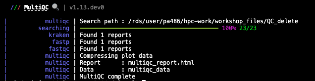 You can now go ahead and perform the MultiQC with the below command. We will only add the -f flag which overwrites any existing MultiQC reports.